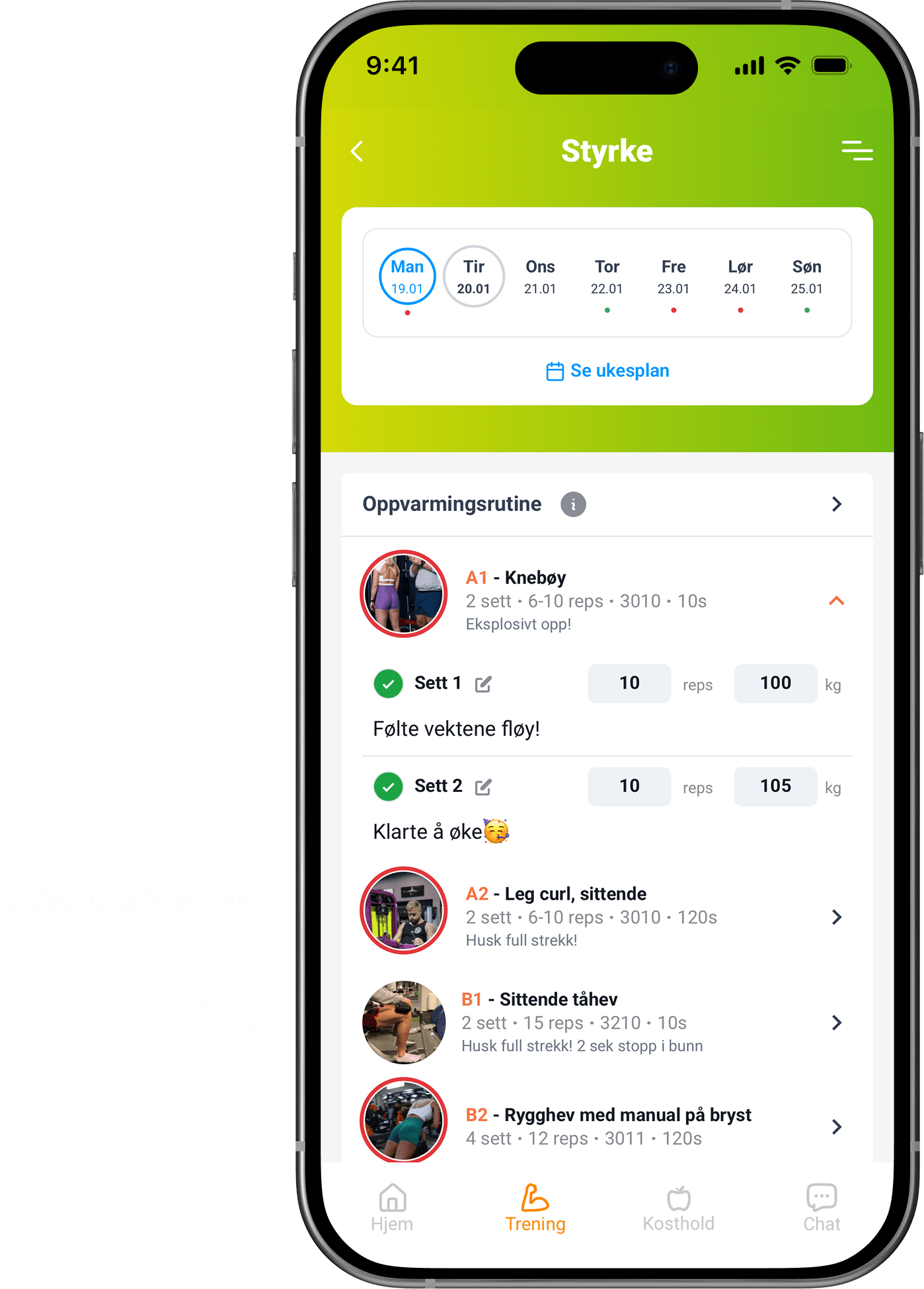 Med treningslogg som husker hva du løftet sist.